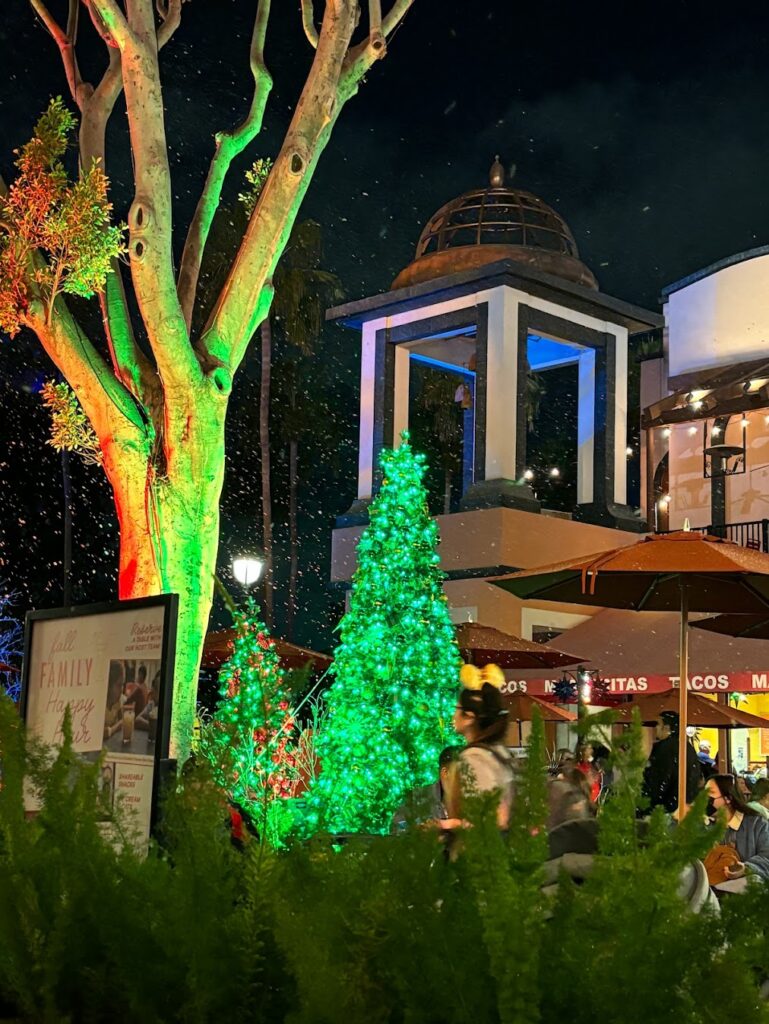 For a Texas girl like me, snowing in any fashion is quite fun, even in soap/bubble form. Though the current schedule hasn’t been released, last year it “snowed” every 40 minutes each night between 6-10 PM. It started on November 29th and continued through January 6, 2024. Not only does it “snow” but the Christmas music plays and it creates a magical moment for those in the Downtown Disney shopping and dining area. One of my favorite things to do on non-park nights!