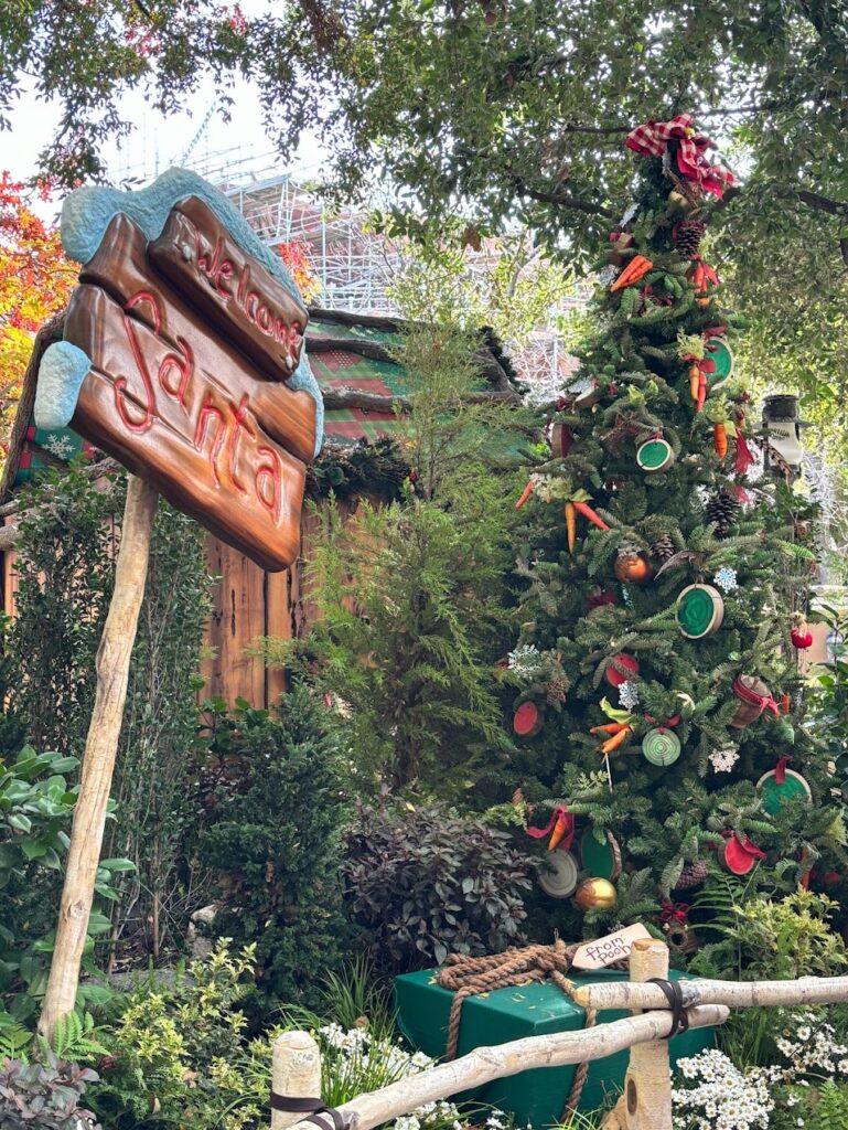 One of my all-time favorite rides (yes, better than the ride at Magic Kingdom!!) is The Many Adventures of Winnie the Pooh. I love getting in my honey comb and seeing the bright colors, the heffalumps and woozles, and some of my dear childhood friends. The queue has festive garland as you walk in, but the best part is seeing the Christmas trees and signs decorated by characters. The carrots on this tree help me know Rabbit did the decorating here! After the ride, be sure to visit Pooh Corner for one of my favorite treats, a tigger tail! Then, if you time it right, you can see some of your favorite Pooh characters in their Christmas hats in the meet-and-greet area.